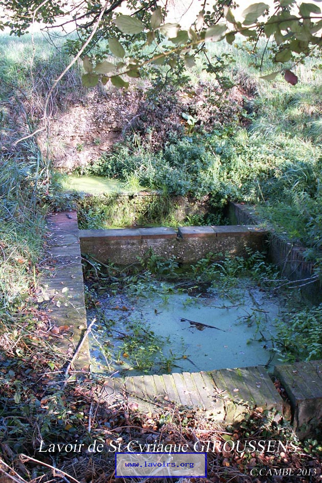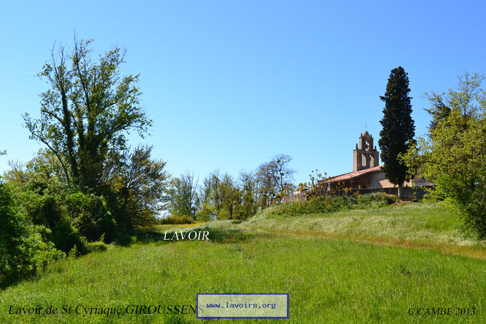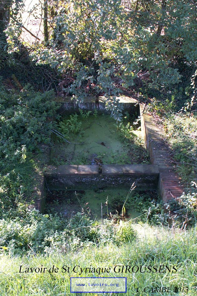 Le lavoir est situé à 3km à l'Est de Giroussens prés de la chapelle de Saint Cyriaque .Non couvert il est composé de deux bassins construit en briques ,alimentés par une petite source qui jailli du talus.